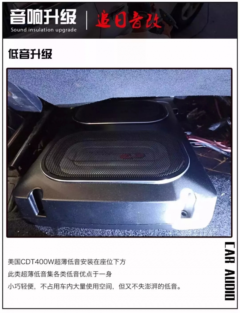 本次為 【起亞智跑】 進行升級,采用的是 CDT90.4功放+ 400W超薄低音 ,由 【沈陽追日音改】 進行升級。