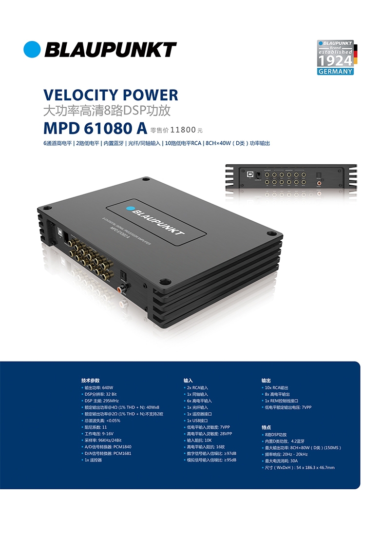 德國(藍寶BLAUPUNKT)大功率高清8路DSP功放 MPD 61080 A